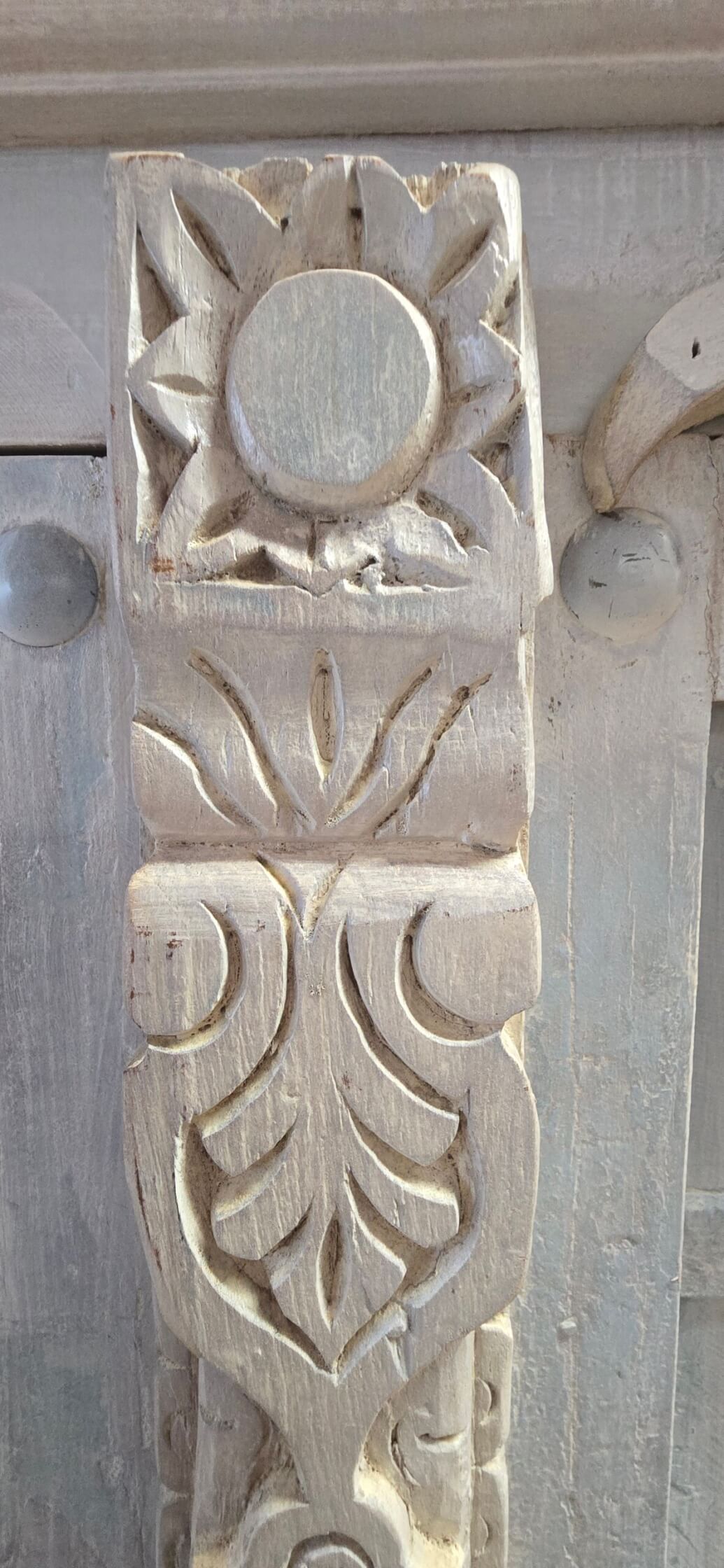 La barre de fermeture verticale, conservée d’origine, arbore des sculptures florales et géométriques , rappelant ainsi l’histoire et le savoir-faire des artisans indiens.
