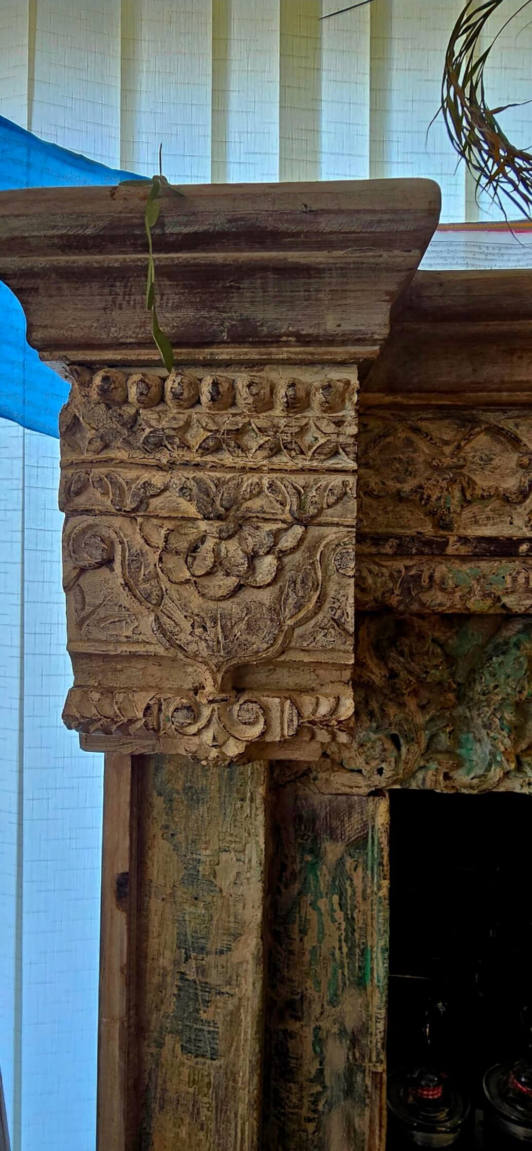 Offrez-vous une pièce d’exception avec cette bibliothèque indienne ouverte. Véritable hommage à l’artisanat du Rajasthan, ce meuble est construit autour d’une ancienne porte sculptée récupérée, dont le linteau et les montants arborent des motifs floraux traditionnels.