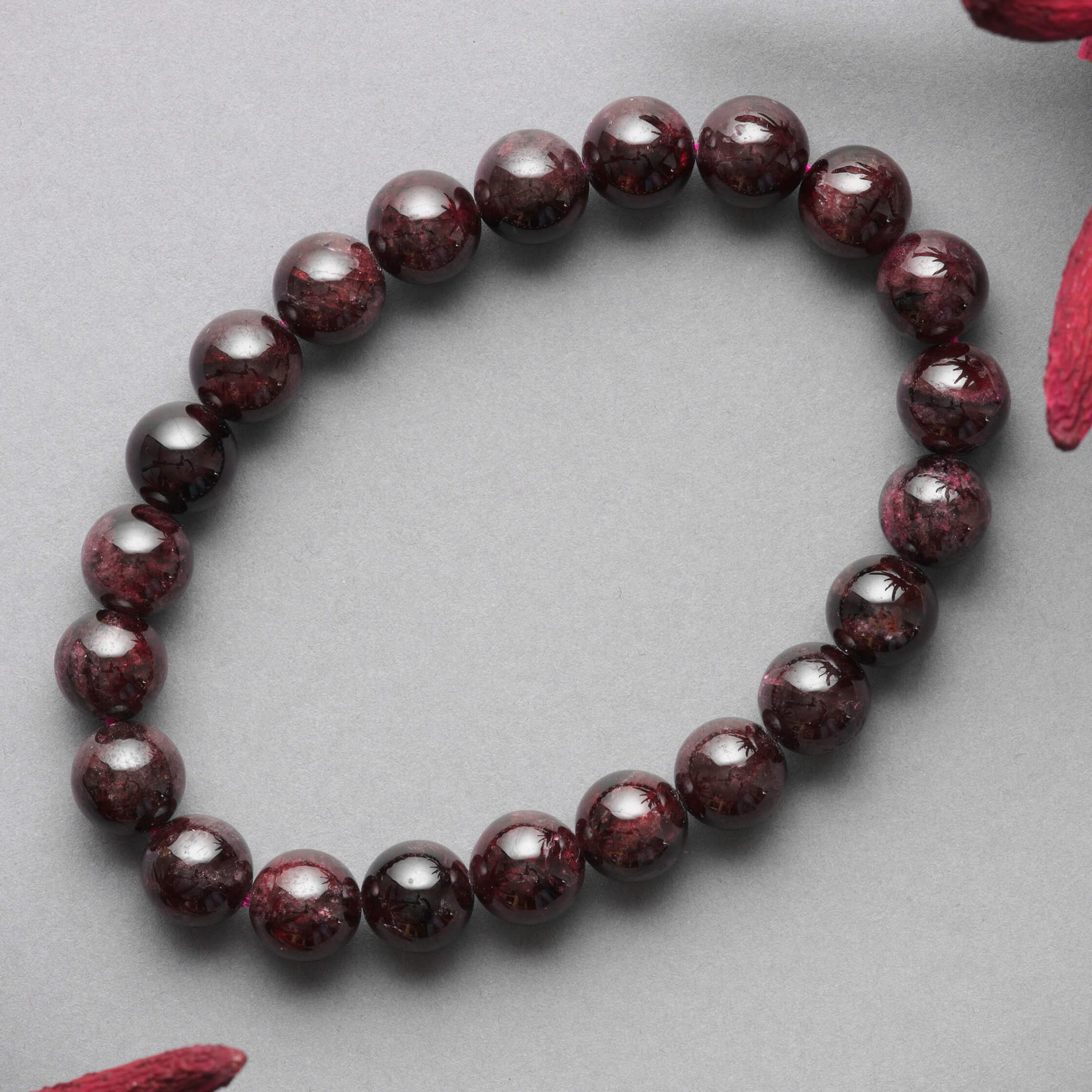 Bracelet en perles de grenat rouge , particulièrement apprécié dans le domaine de la lithothérapie.