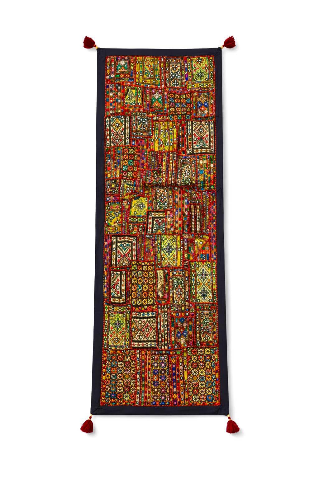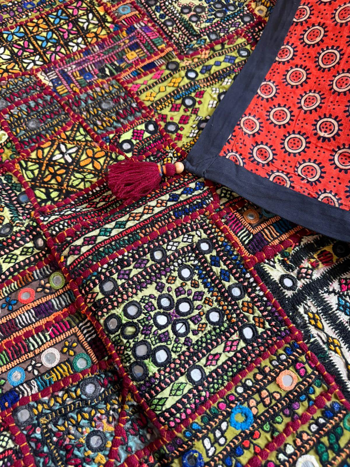 Cette tapisserie décorative se ainsi distingue par ses motifs géométriques vibrants, ses broderies élaborées et aussi ses incrustations de miroirs caractéristiques du style « Ralli » propre à cette région du nord-ouest de l’Inde.