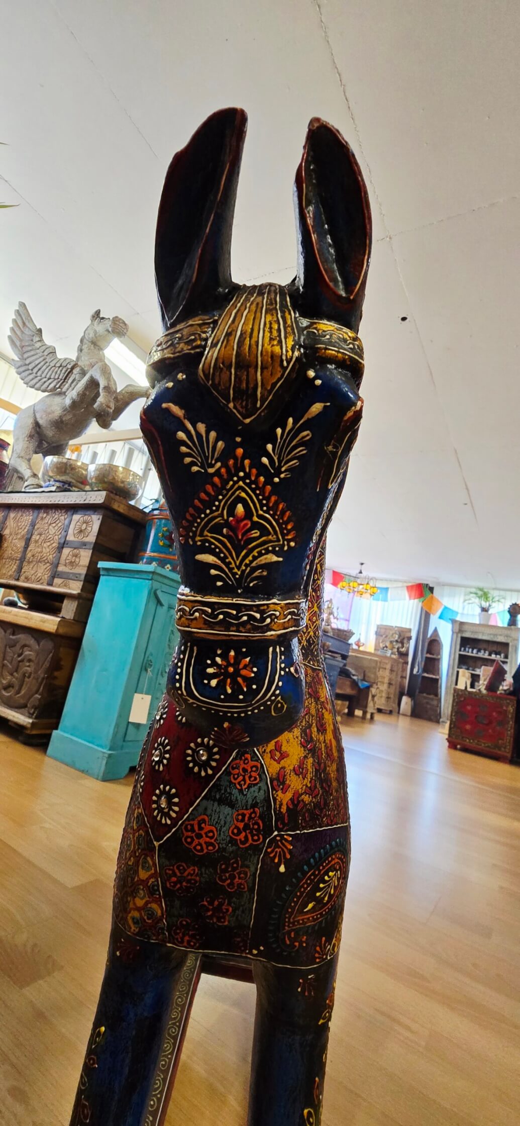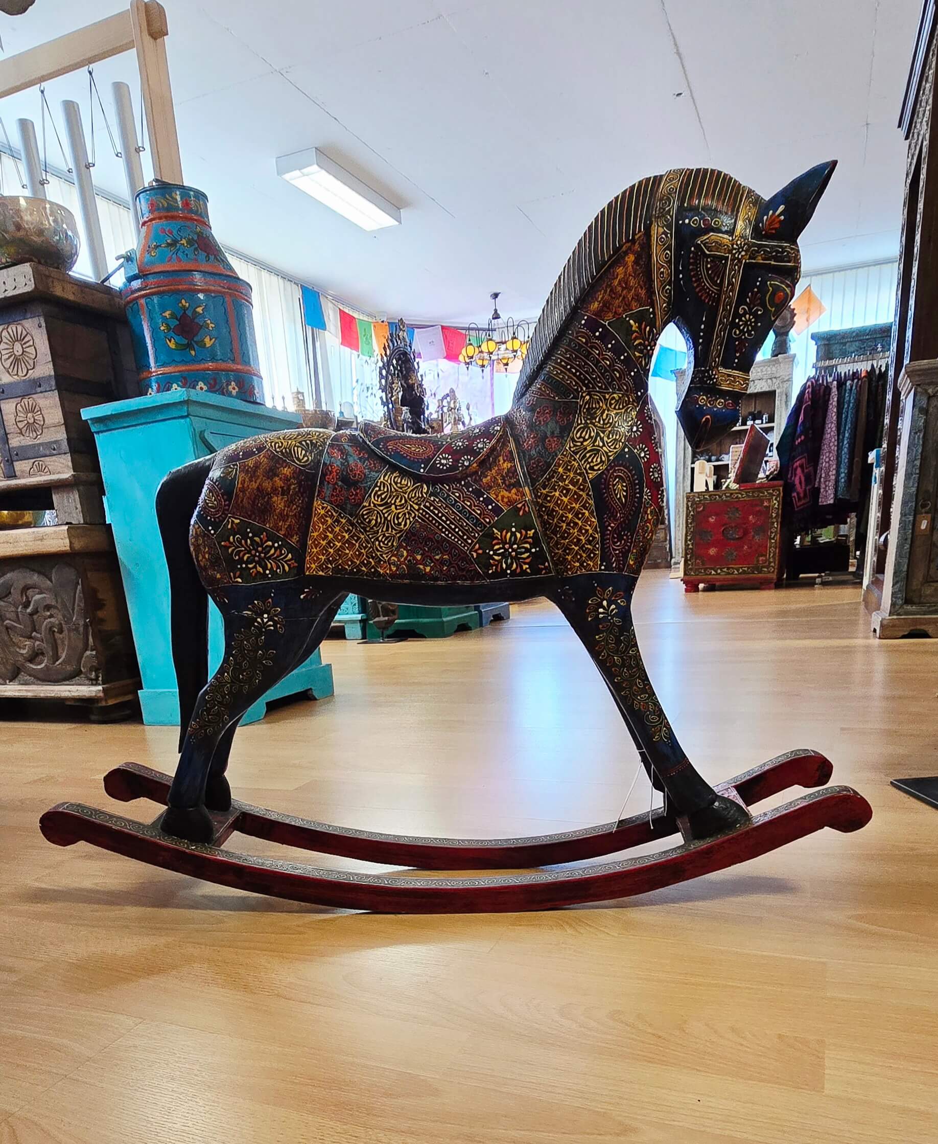 Ce cheval à bascule est un hommage à la culture indienne, avec des détails soigneusement travaillés par des artisans locaux.