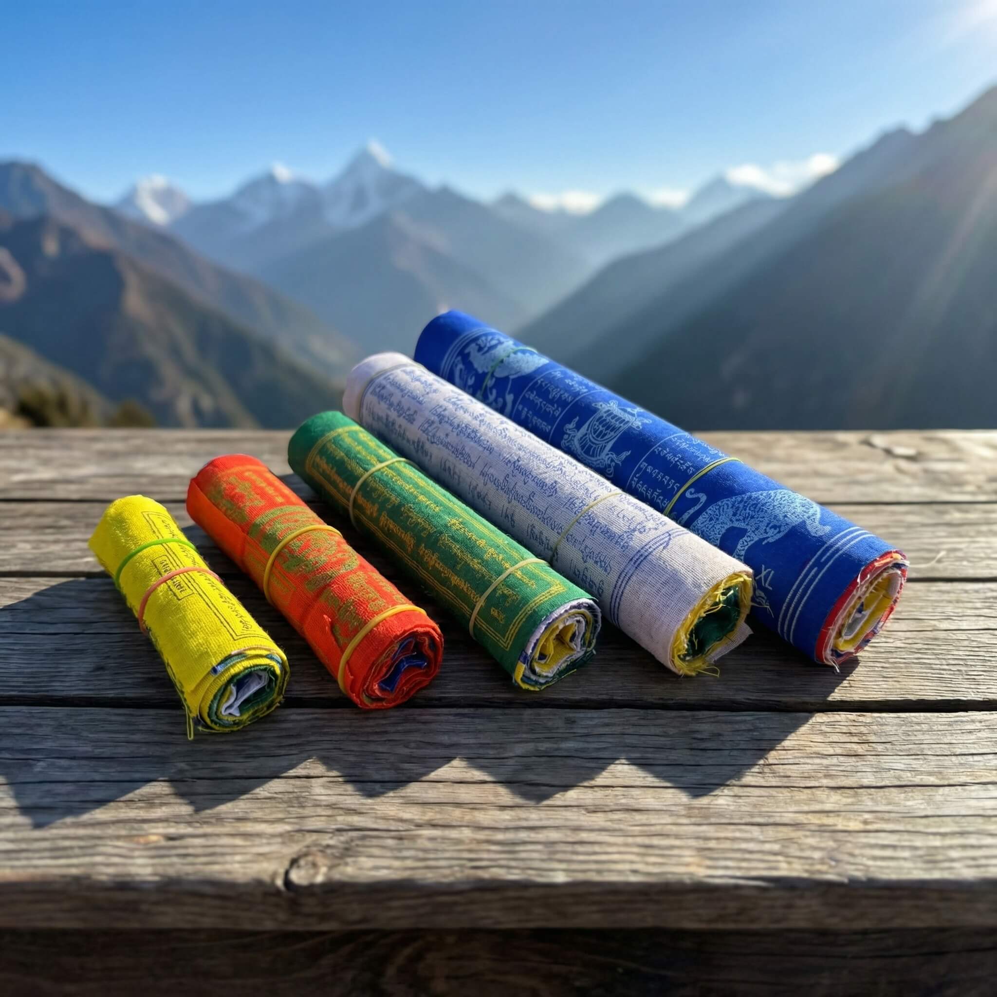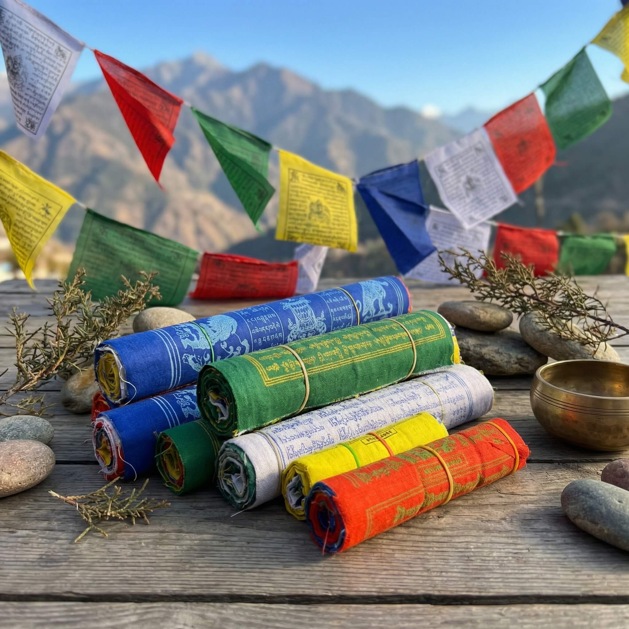 Les drapeaux de prière tibétain sont traditionnellement arrimer sur des temples, des montagnes, etc. Le vent qui caresse au passage les formules sacrées imprimées sur les drapeaux et les disperse dans l’espace, est censé leur donner vie et les transmettre ainsi aux dieux et à tous ceux qu’il touche dans sa course.