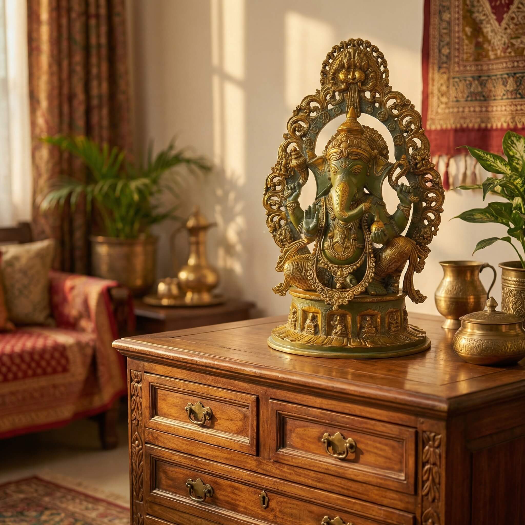 Ganesh assis teinté en vert et or