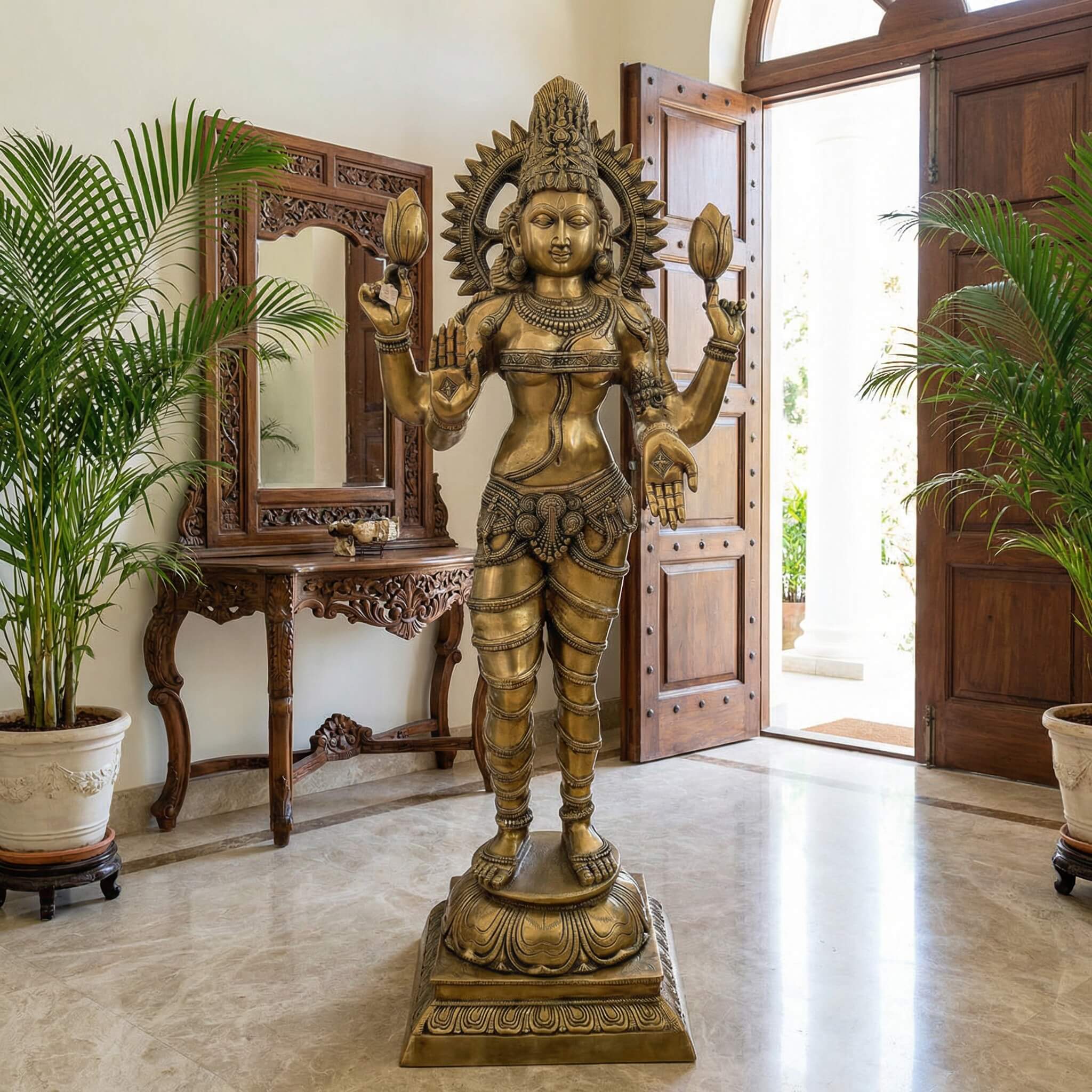 Le bronze, matériau durable et noble, symbolise la permanence des qualités de Laxmi.
