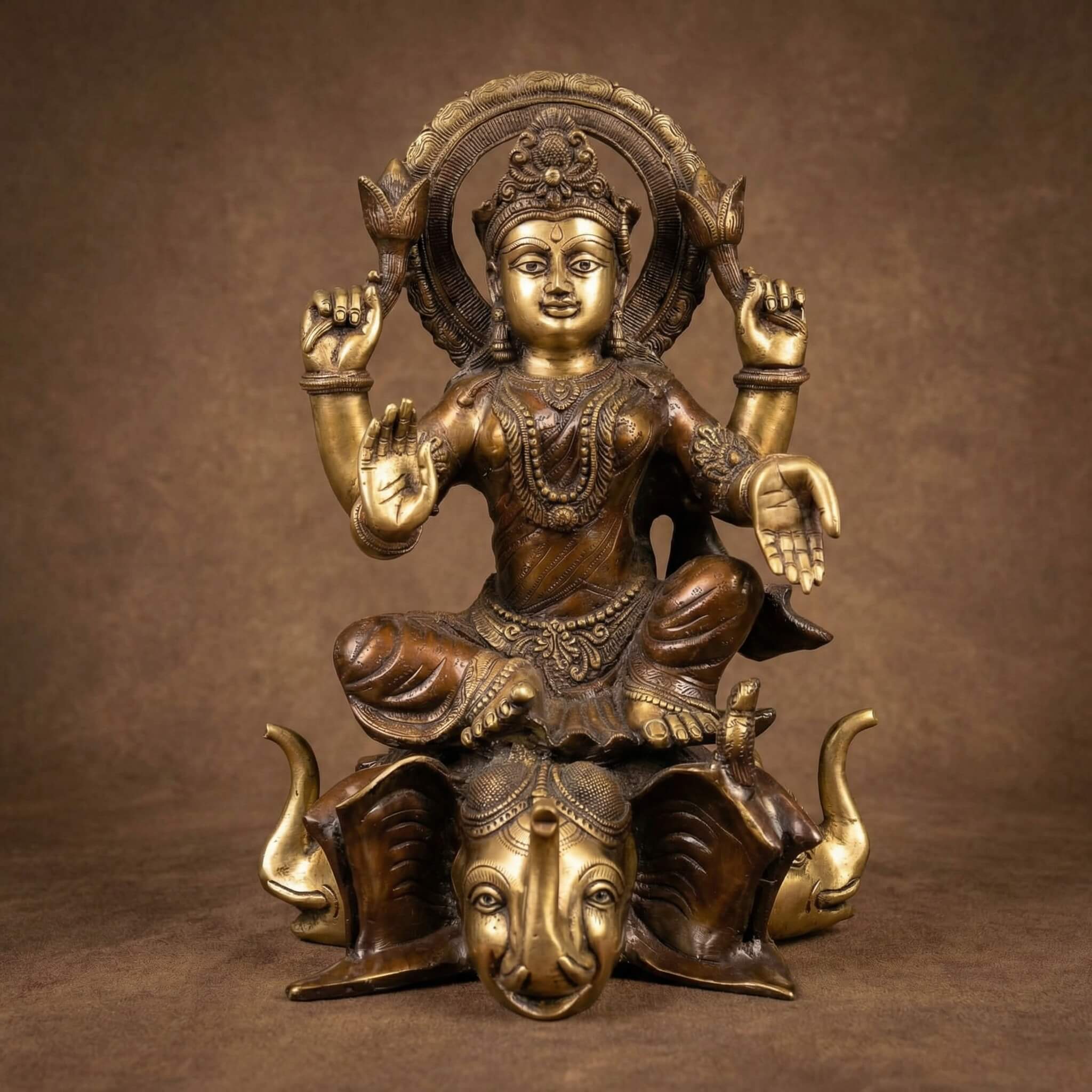 Superbe statue de Lakshmi en bronze, dominant depuis son piédestal composé de trois éléphants. Réalisée dans le Nord de l’Inde.