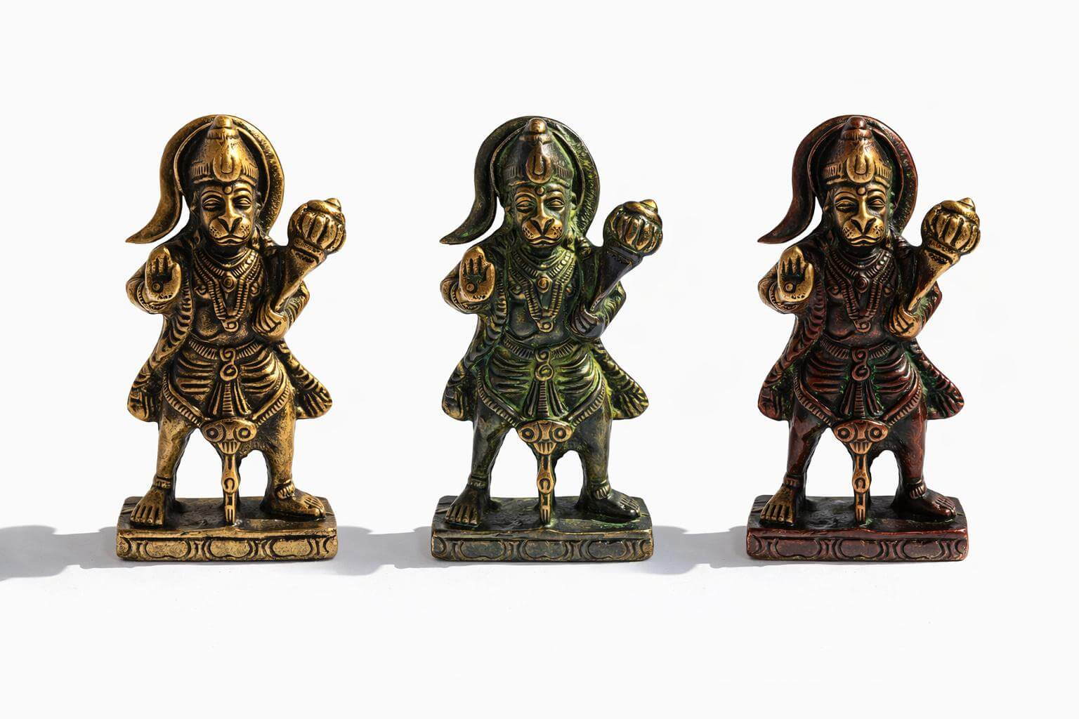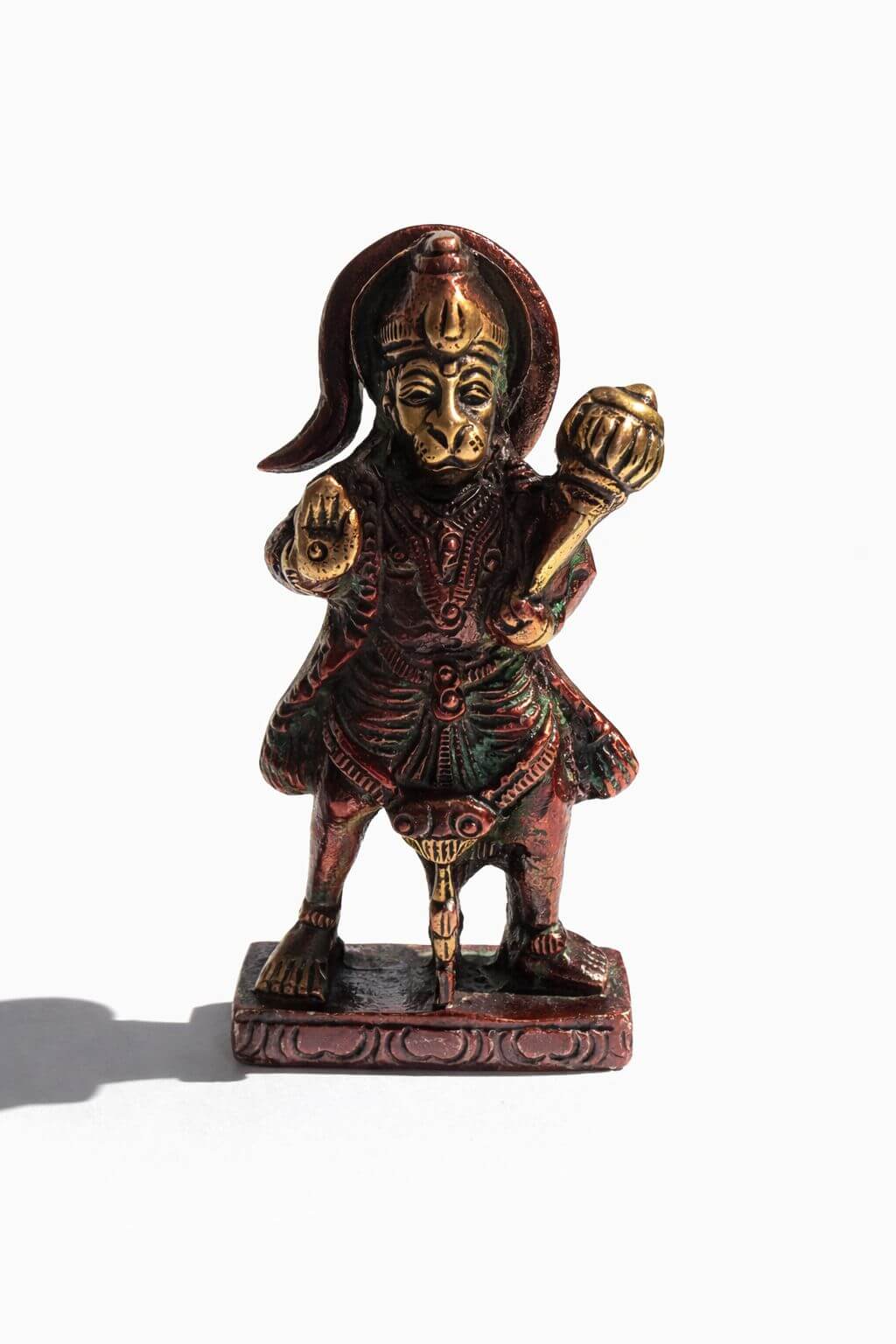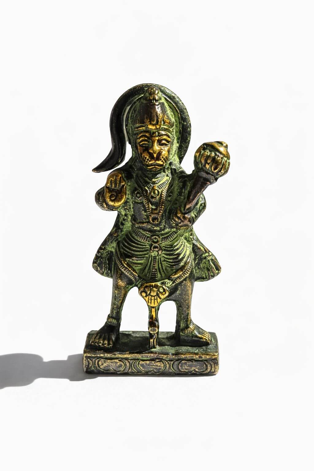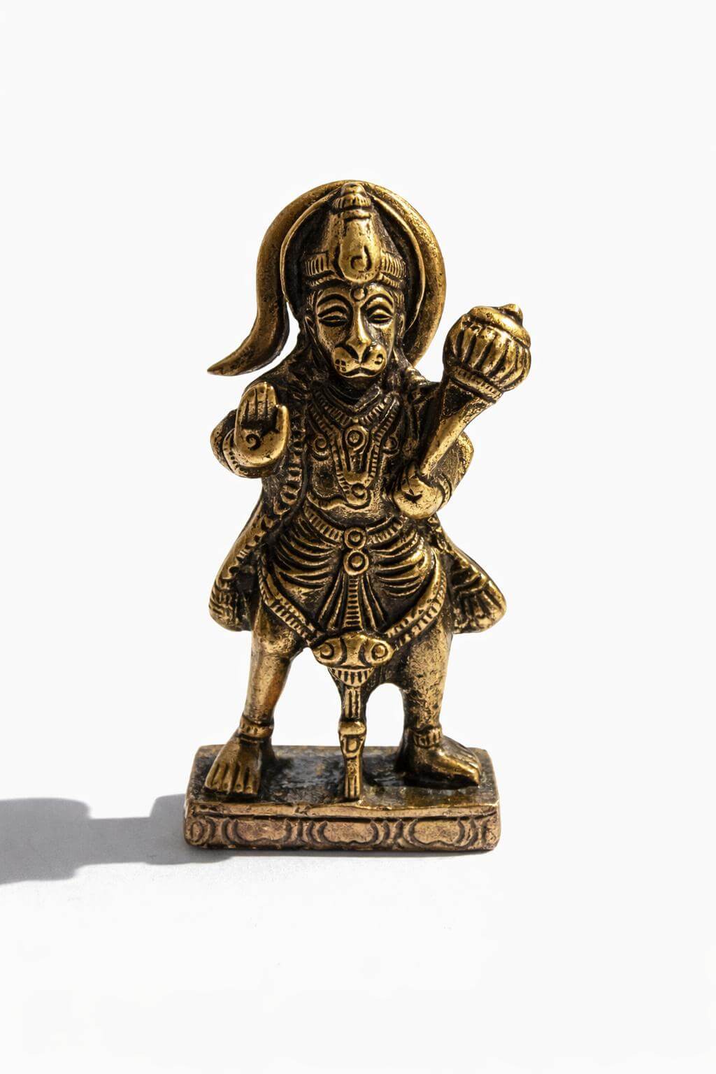 On distingue aussi clairement la posture dynamique de Hanuman, sa main levée en signe de bénédiction (Abhaya Mudra) et l’autre tenant la massue (Gada), symbole de sa force.