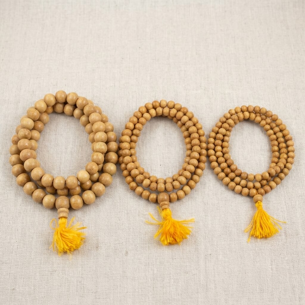 Découvrez nos malas traditionnels en bois clair, fabriqués artisanalement au Népal.