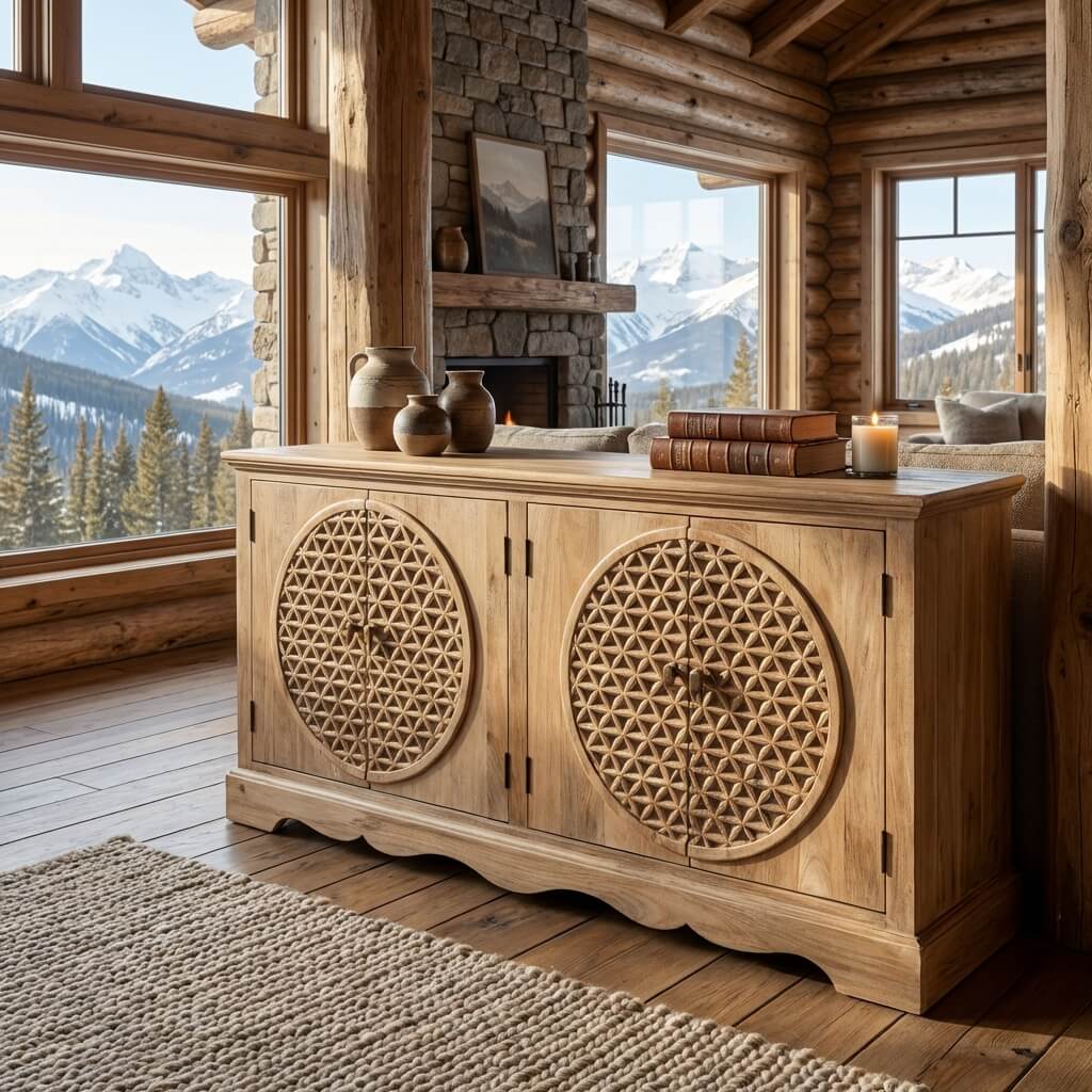 Meuble contemporain en bois de manguier — Motif Fleur de Vie — Rajasthan, Inde