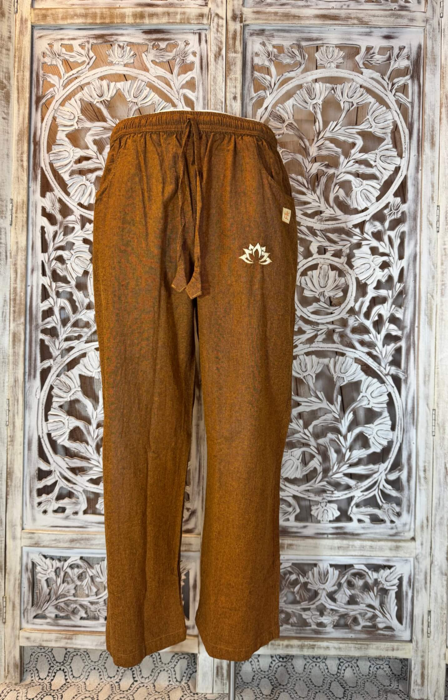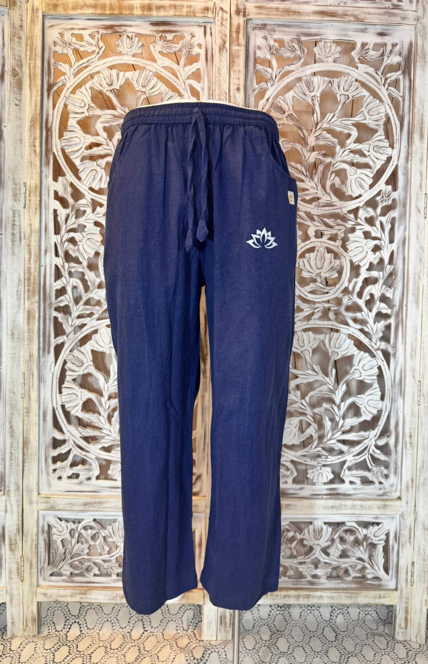 Une fleur de lotus brodée orne la hanche. Ce symbole, synonyme de calme et d’éveil, ajoute une touche unique à ce vêtement d’inspiration népalaise.