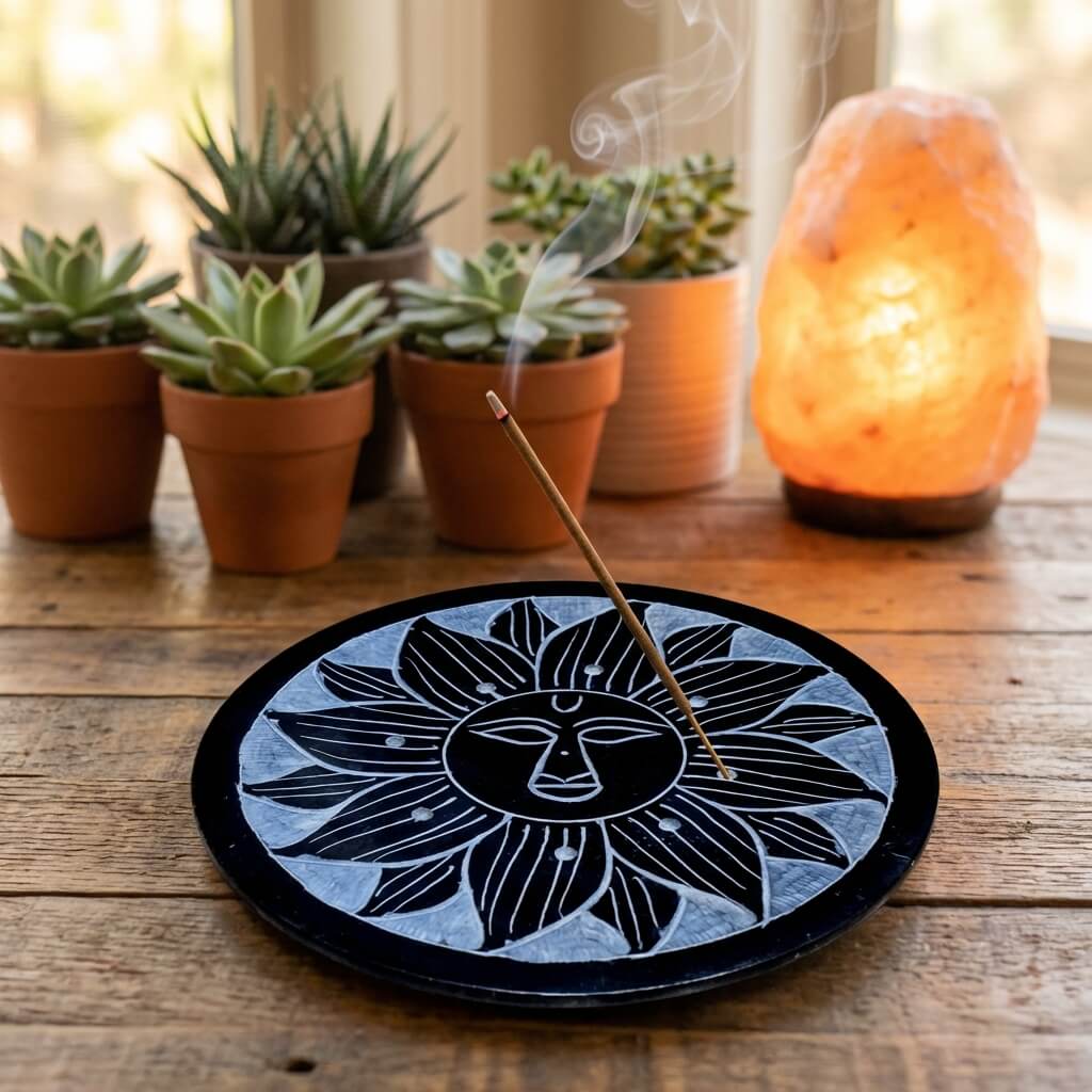 Plateau circulaire en pierre noire, orné d’un soleil stylisé aux traits divins — un objet sacré pour vos rituels, méditations ou moments d’énergie positive. Parfait pour les encens en cône ou bâton.