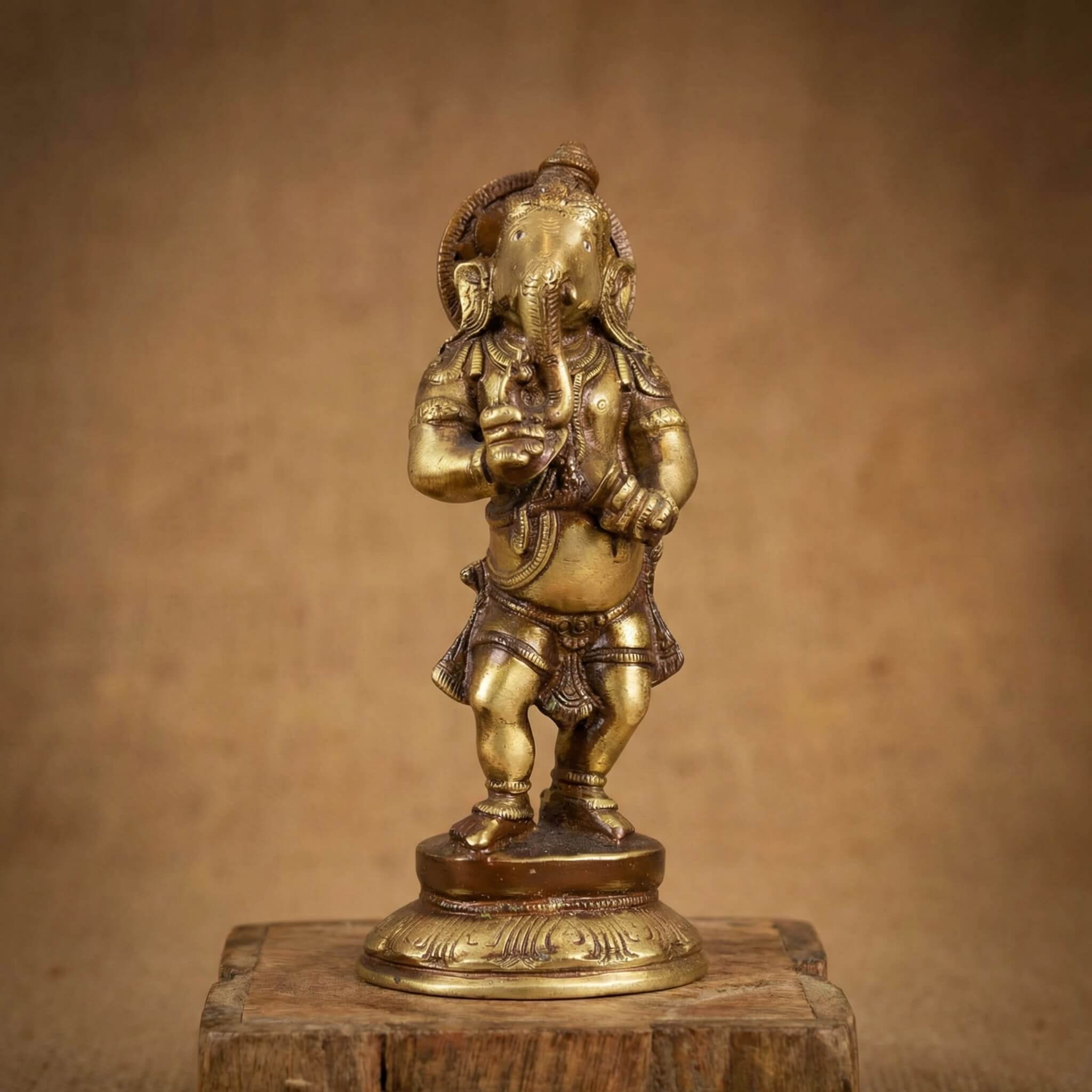 Chaque Ganesh tient un instrument : flûte, tambourin ou cymbales — symbolisant l’harmonie, la joie et la créativité. Leur posture est dynamique. Leur sourire bienveillant et leurs détails ciselés en bronze doré en font des œuvres d’art à la fois spirituelles et décoratives.