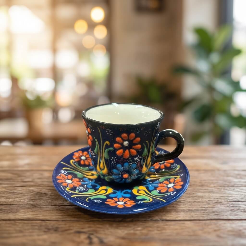 - Design : Motifs traditionnels colorés et soucoupe assortie.