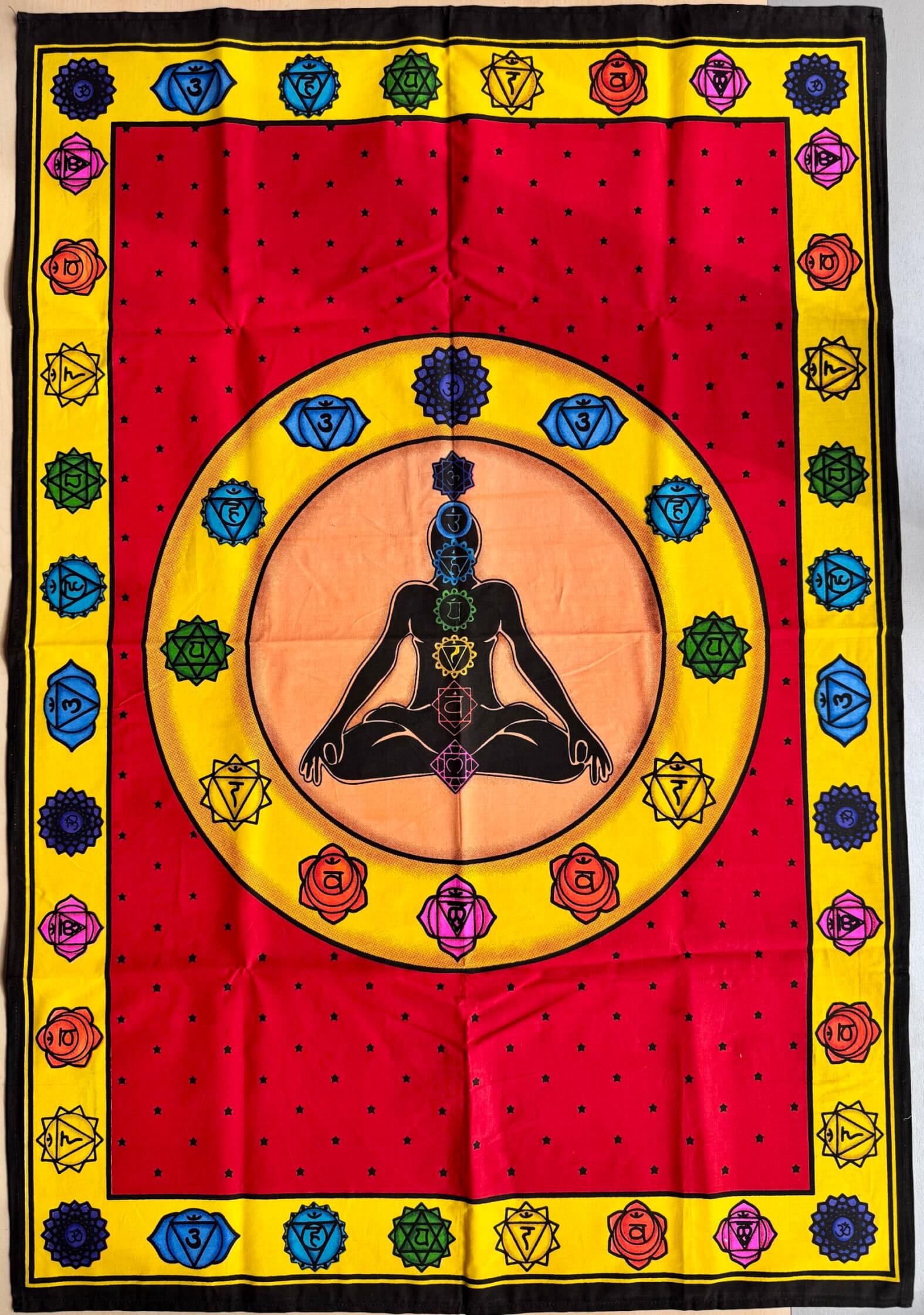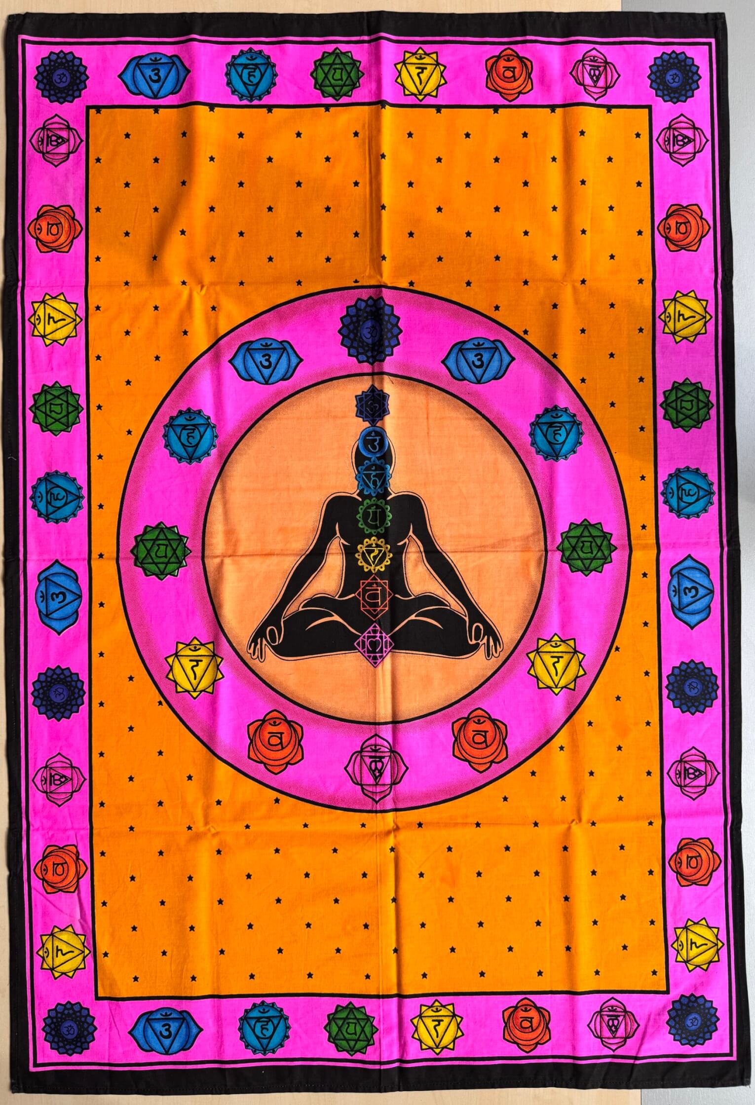 Le fond orange ou rouge de la tenture met en valeur les couleurs vives des chakras, créant une atmosphère apaisante et équilibrée, idéale pour la méditation ou le yoga. c’est est un outil de réflexion personnelle et de développement spirituel, invitant à une exploration intérieure des énergies subtiles.