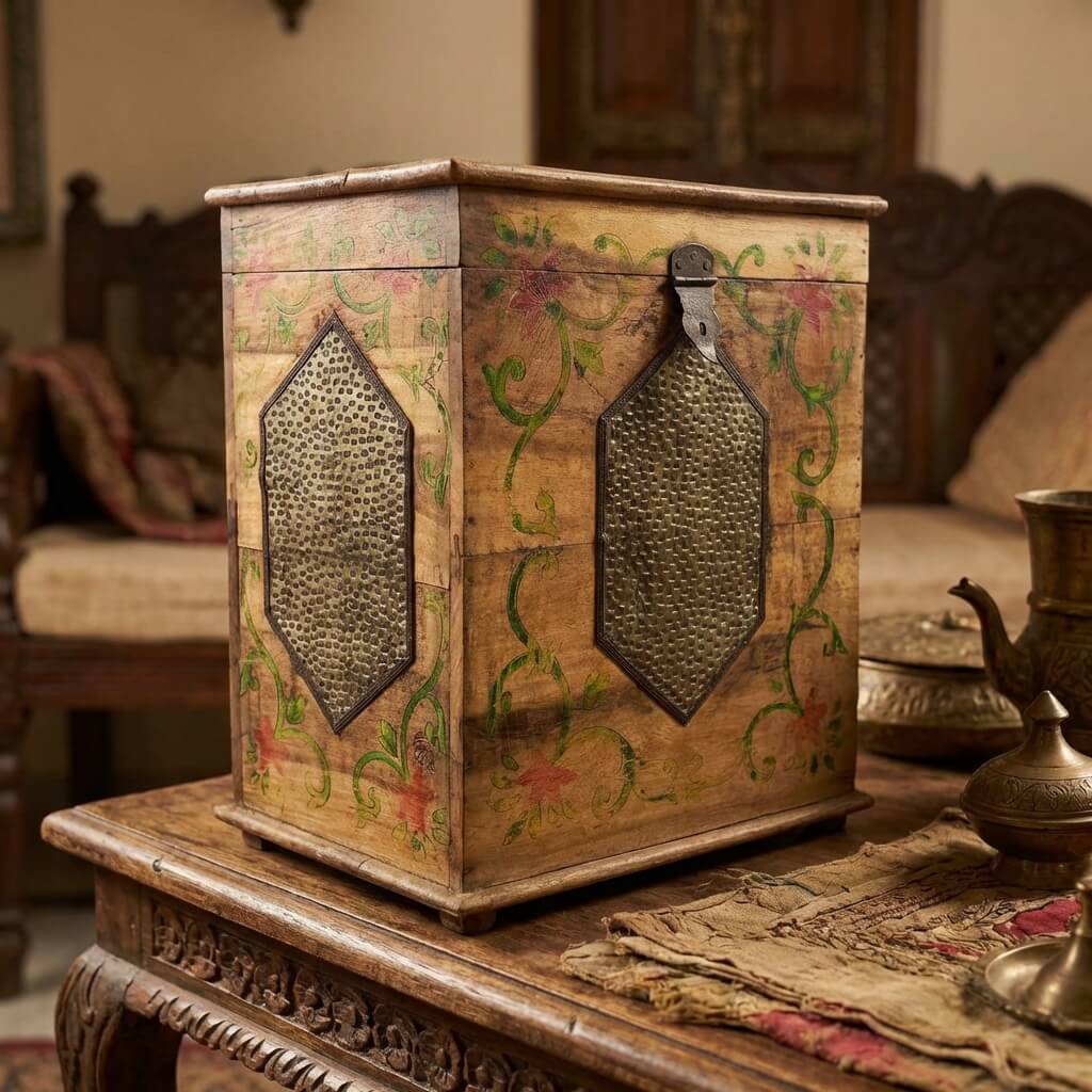 Diese Flaschenkasten aus handbemaltem Holz ist ein Einzelstück voller Charme und Kreativität. Er wird in Indien handwerklich hergestellt und besticht durch seine sanften Farben, seine Blumenmuster und seine Fronten aus gehämmertem Metall, die ihm einen Vintage-Stil verleihen, der zugleich originell ist.
