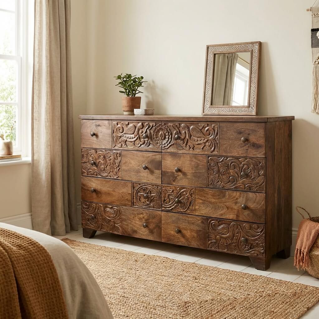 Die Maharaja-Kommode ist ein außergewöhnliches Stück, das in Indien aus massivem Teak- und Mangoholz handgefertigt wird. Mit seinen acht großen Schubladen und den fein geschnitzten Fronten verkörpert er die Eleganz und Noblesse traditioneller indischer Möbel.