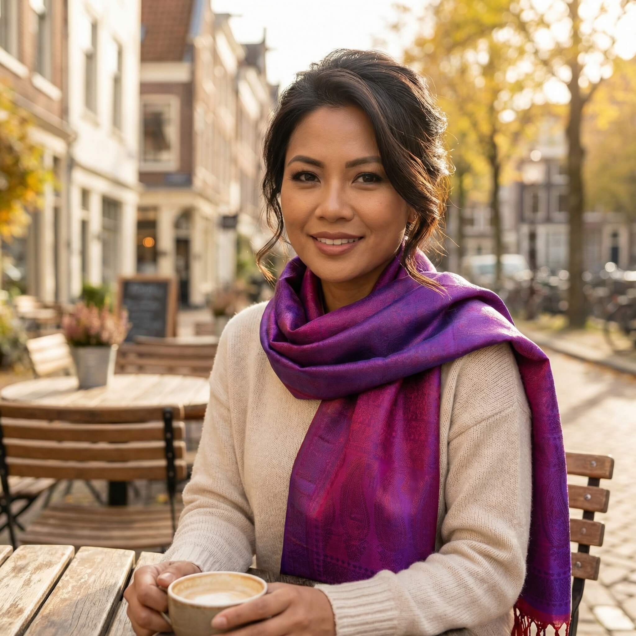 Apportez une touche d’élégance raffinée à votre style avec ce foulard bicolore en soie pure, tissé artisanalement en Inde. Sa texture légère et fluide en fait un accessoire agréable à porter en toute saison.