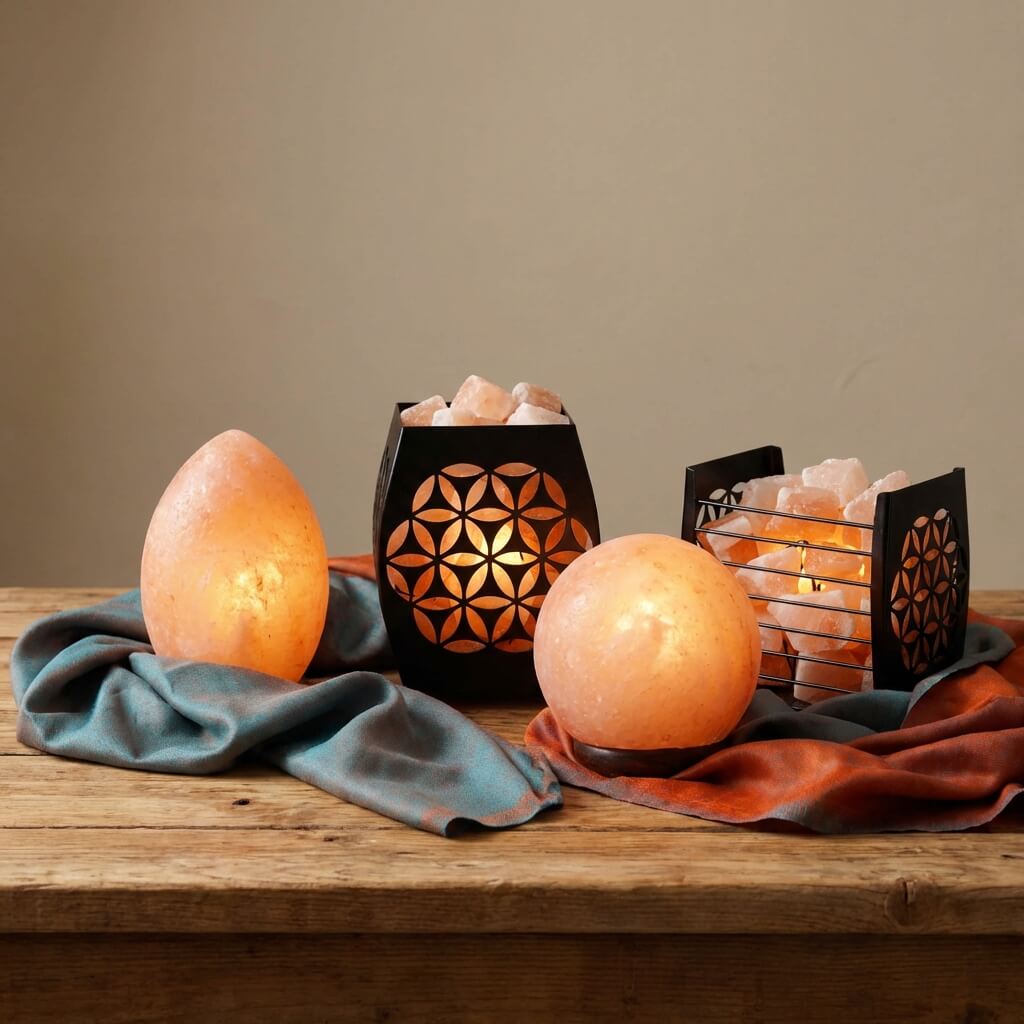 Découvrez notre collection de lampes de sel d’Himalaya aux formes organiques et aux designs inspirés de l’harmonie : œuf, sphère et diffuseurs décoratifs gravés de la Fleur de Vie. Chaque pièce est taillée à la main dans un bloc de sel rose fossile, riche en minéraux, et montée sur un socle en bois ou en métal noir mat.