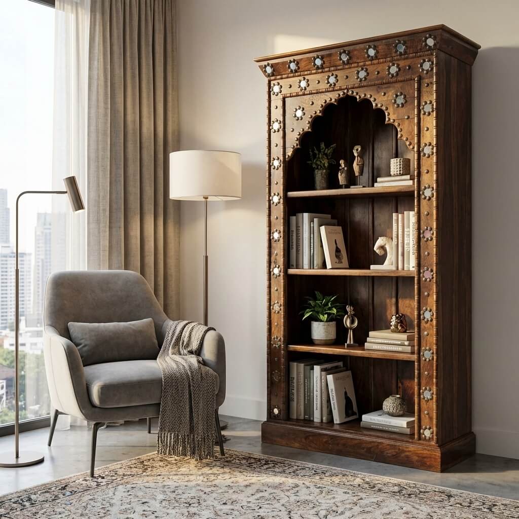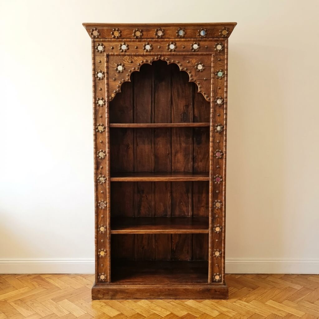 Donnez une touche d’exotisme et de caractère à votre intérieur avec cette superbe bibliothèque ancienne. Fabriquée en bois massif teinté dans des tons chauds, elle se distingue par son style unique, inspiré des traditions artisanales indiennes ou marocaines.