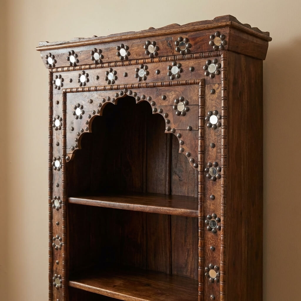 - Design Exceptionnel : Ornée de nombreuses incrustations de petits miroirs circulaires et de clous décoratifs, cette pièce est un véritable objet d’art. L’arche sculptée en haut de l’ouvrage ajoute une élégance particulière.