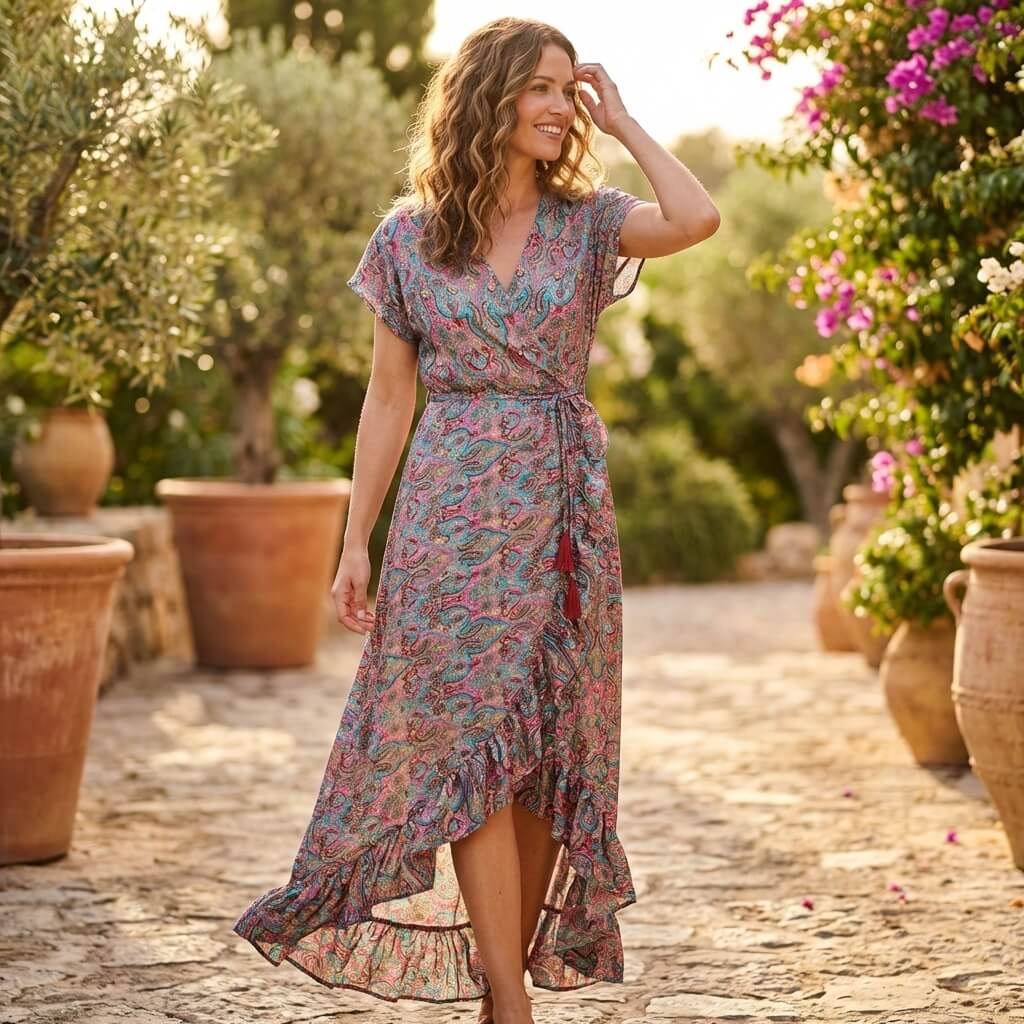 Das Varanasi-Kleid hat einen schmeichelhaften Wickelschnitt, der an der Taille anliegt und so die Silhouette betont. Mit seinem fließenden Stoff und dem herzförmigen Ausschnitt vermittelt es die zeitlose Eleganz der indischen Frauen. Ein Must-have, das sowohl bequem als auch raffiniert ist.