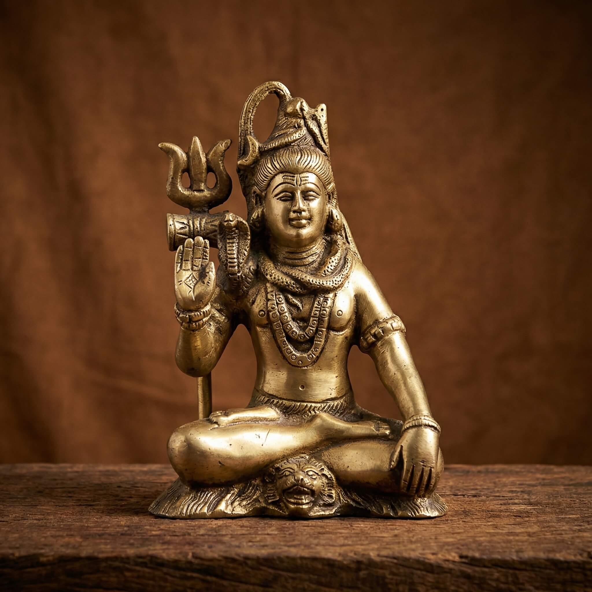 Découvrez la statue de Shiva assis avec un trident, une œuvre en bronze faite à la main. Parfaite pour apporter une touche spirituelle à votre espace.