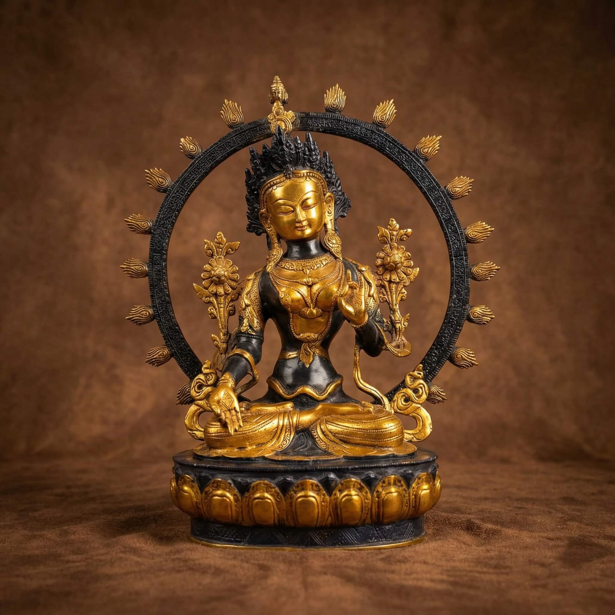 Wunderschöne weiße Tara aus Bronze mit Gold- und Schwarzfinish, hergestellt in Nordindien.