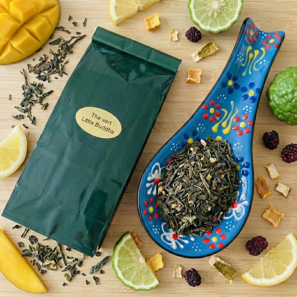 Laissez-vous séduire par le Thé Vert de Chine Little Buddha, alliant les saveurs de mangue et de bergamote. Une expérience à savourer pleinement! 🍵